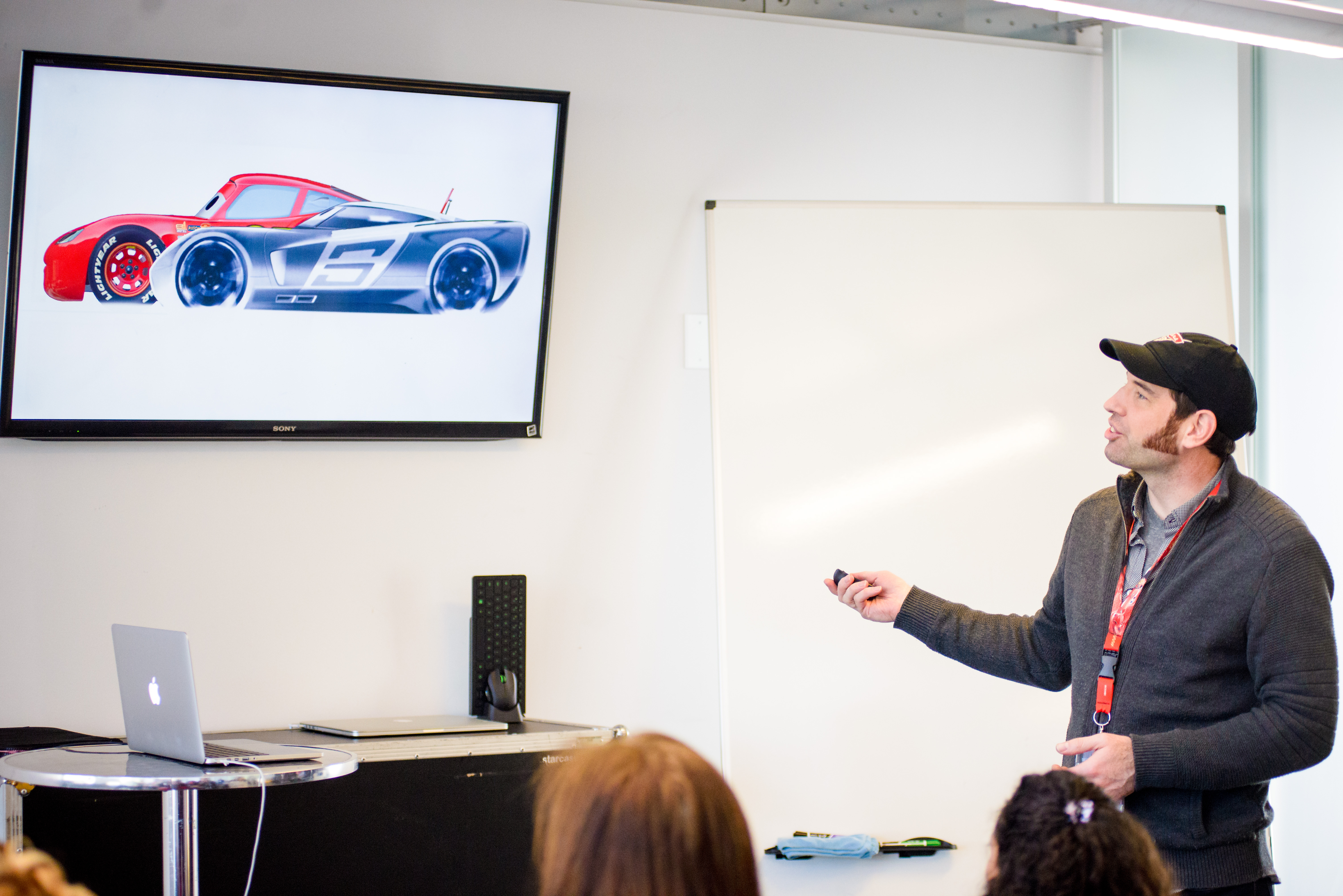 “For a design like his, we start with a blank sheet of paper,” explains Production Designer Jay Shuster. “The goal is to use shape, paint and graphics to create a character that contradicts McQueen in every possible way. So at Pixar, we have this iterative design process. We’ve got to get every design up on the wall, doing hundreds of sketches, keeping in mind the design conceit that McQueen is round and flowing so Storm has to be angular and sharp. After all these initial design directions and explorations, we employ the talents of folks like Jay Mays, a former head of design at Ford and a good friend of John Lassiter. He workshoped the design of Storm a couple of days at Pixar.”