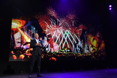 Switching to Pixar, Bob Chapek played a video where Toy Story characters try to peak over the walls at Toy Story Land at both Disney's Hollywood Studios and Shanghai Disneyland. Afterwards, John Lasseter joined him to announced Pixar Fest coming to Disneyland, a celebration that will bring a new fireworks show to Disneyland. As part of the celebration, the Pixar Play Parade will move to Disneyland and Paint the Night will return to the resort, but this time at Disney California Adventure where a new Pixar float will be added.