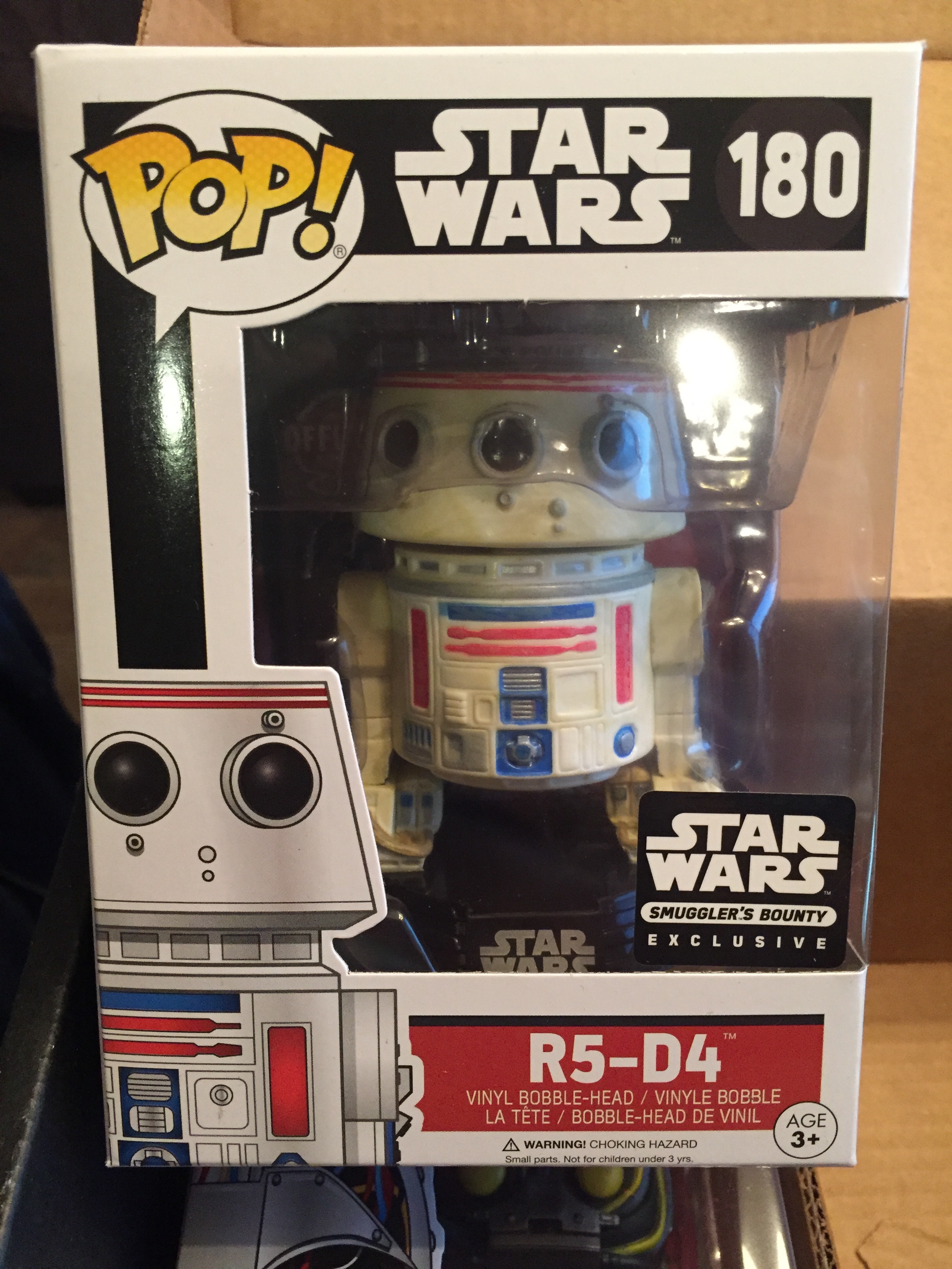 The other figure is a Pop! bobble head of R5-D4. If you don't instantly recognize him, he's the droid that Luke's Uncle Owen wanted to buy, but when he clunked out they swapped him for R2. I've always had an affinity for this misfit and was thrilled to find him underneath the t-shirt. Be sure to give R5 a really good home, he deserves it.