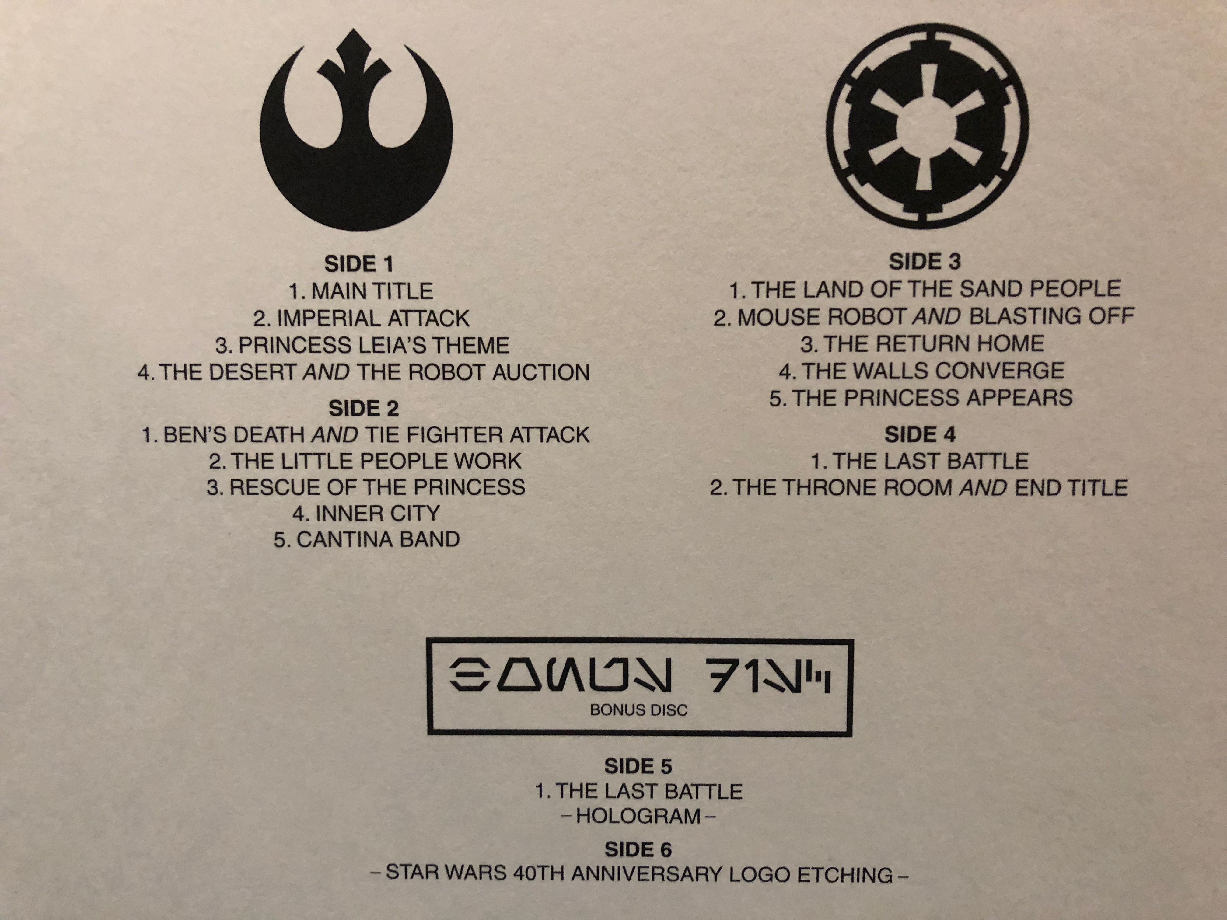 The third LP adds an extra wow factor with a hologram etched side that features a rotating Death Star when you spin the disc. It does contain music as well, the 12-minute track "The Last Battle" which is also on Side 4 of the release. This was my first hologram disc, although I did see a demonstration of the one previously released for The Force Awakens at the D23 Expo. It looks like the Death Star is spinning slightly above the record, while a reflection of it is deep inside. The other side of this bonus LP doesn't have any audio content, but makes a lovely display as it features the 40th Anniversary logo etched into the vinyl. (The image doesn't do it justice, it is spectacular in person.)