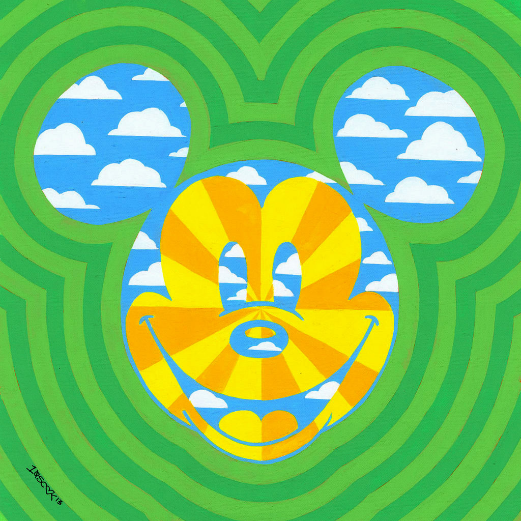 This coffee table book collects all one hundred pieces from the series, as well as a few that were rejected by Collector's Editions, and examples of Tennessee Loveless' other works, including paintings of pop culture icons like Marilyn Monroe, Judy Garland, and David Bowie. Each painting features the same image of Mickey Mouse at the center, but the work eclectically changes and is arranged into ten chapters by theme, each one containing ten images. This mathematical breakdown is part of Loveless' brilliance, which is sometimes even applied to the pieces directly. For example, one piece called "Steamboat Willie Unlocked" divides the pitch and frequency of "Turkey in the Straw" by time into geometric patterns with specific colors applied to each instrument behind a black and white Mickey face. The artist's intent was for people to visually feel the music.