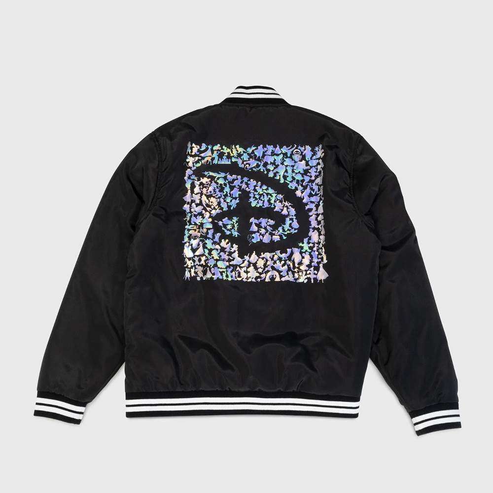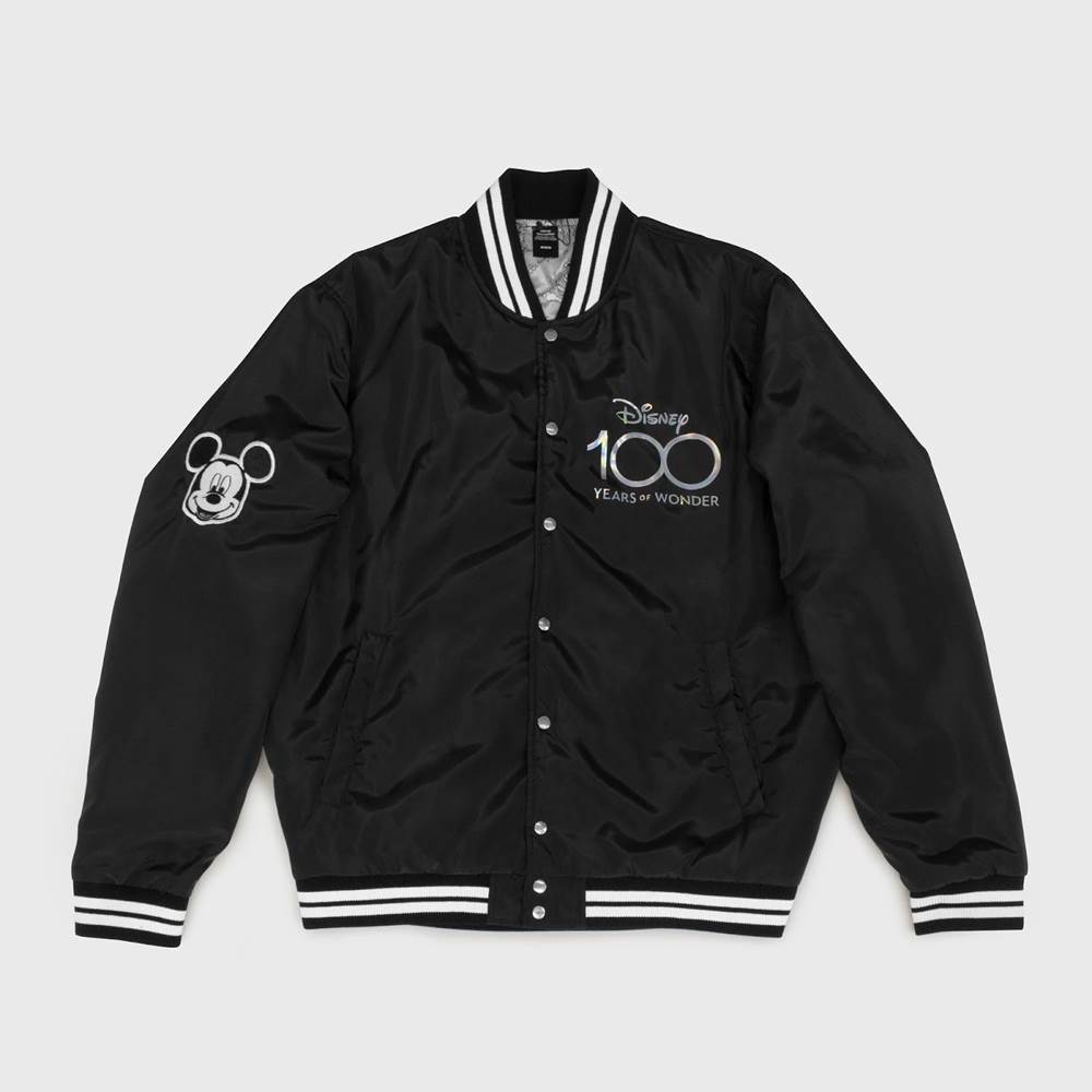 - One of the standout pieces in this box is the bomber jacket that features a Mickey Mouse patch on the right shoulder, D100 logo on the left chest, and Disney “D" surrounded by character silhouettes on the back.