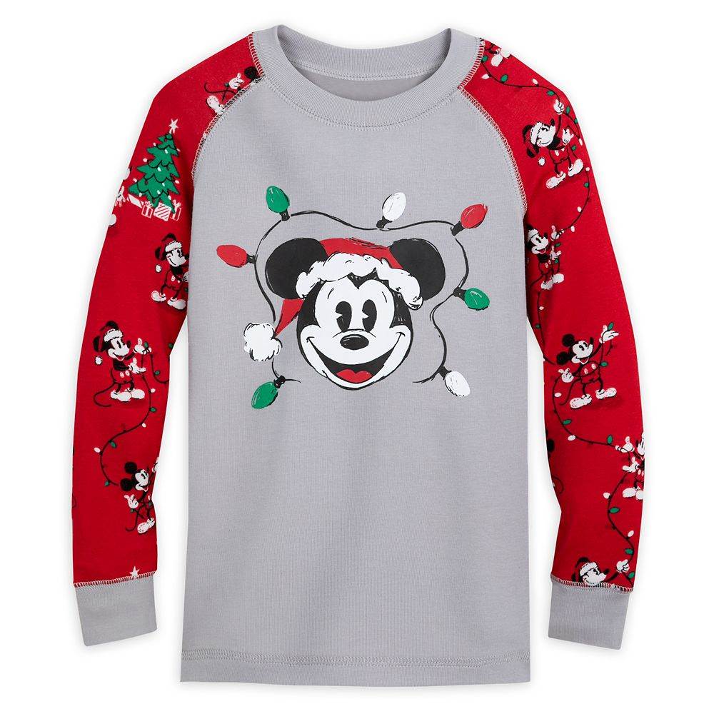 - The bright red pajamas feature a Mickey Mouse pattern that shows the global icon dressed in a Santa suit and decorating a tree with a string of lights. On the adult and kid styles, the pajama tops are solid grey on the chest and back (like a ringer tee) with a smiling Mickey head and colorful lights on the front.