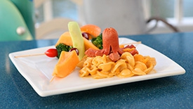 Lunch has four new dishes. Ursula’s Octo-Dog is a hot dog carved into the shape of an octopus (a good trick to try at home) served with mac-n-cheese and fruit and veggie skewers. Whozits & Whatzits is baked chicken nuggets with fruit and veggie skewers. The Clammy Turkey is a turkey sandwich with a bun that looks like a clam shell served with fruit and veggie skewers. And the Dinglehopper Angel Hair Pasta comes with fruit and veggie skewers, and meets the Mickey Check guidelines.