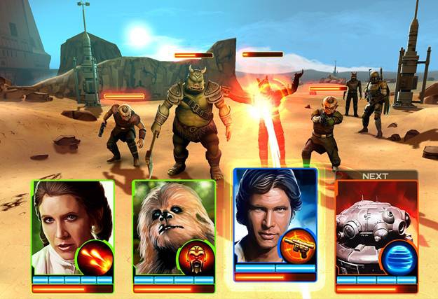 Collect classic Star Wars characters such as Luke Skywalker, Han Solo, Boba Fett, Tusken Raiders, and more as upgradable cards. Each hero has unique stats, abilities, and attacks to increase the team’s overall strength.