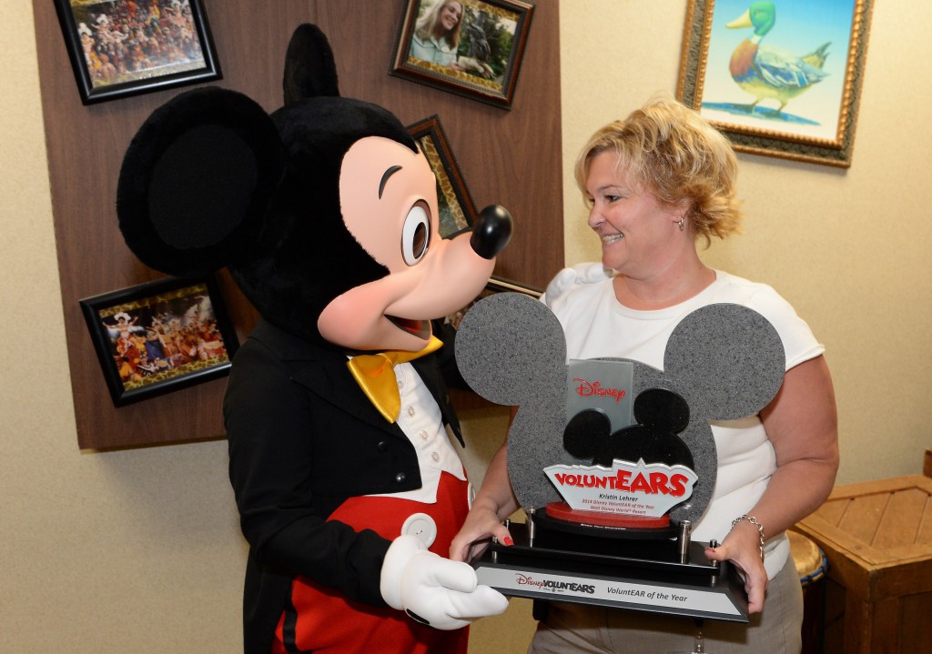 With a surprise celebration, gleaming trophy and handshake from Mickey Mouse, Walt Disney World Cast Member Kristin Lehrer discovered she is the 2014 Disney VoluntEAR of the Year. As part of their ongoing commitment to serving the community, Disney Cast Members chose her for the coveted annual award, which includes a $2,500 contribution to the charity of her choice.