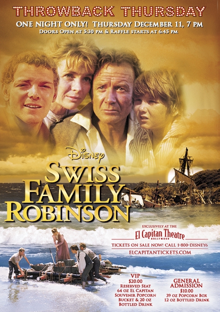 You cast your vote for your favorite 1960's live action film and the votes were so close, we will show 1960's SWISS FAMILY ROBINSON as our December Throwback Thursday film on the 11th at 7pm.