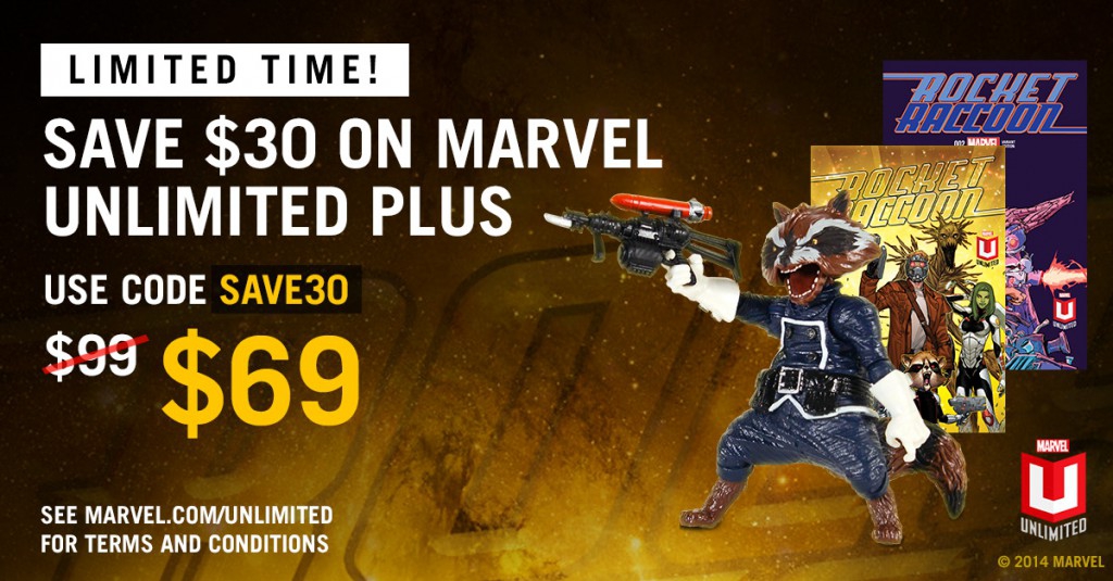 Marvel is celebrating New York Comic Con 2014 by offering fans access to over 15,000 of Marvel’s greatest comics – including the top-selling Age of Ultron event, the star-spanningGuardians of the Galaxy, most of the first issues from the hugely successful and critically acclaimed All-New Marvel NOW! initiative and more. Through October 16th, fans old and new will be able unlock the first year of Marvel Unlimited Plus membership for only $69 using the PROMO CODE SAVE30 at checkout!*