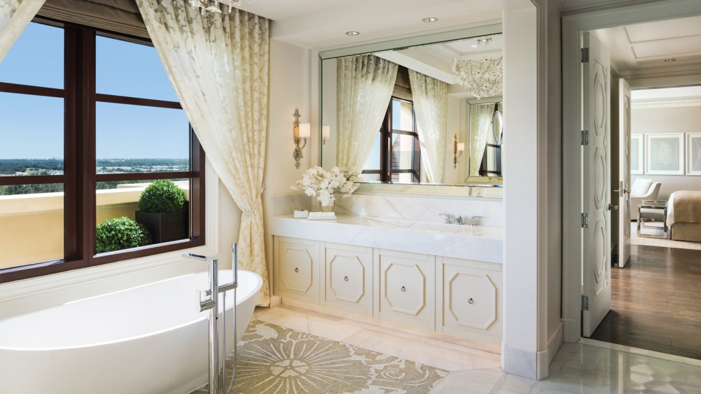 The stunning Royal Suite and Presidential Suite on the Resort’s top guestroom floor are similar in size, with differences in view and select design features. Both of the suites feature state-of-the-art audio/visual integration, including a concealed media screen and projector that drops down from the ceiling in the master bedroom, and in-mirror televisions in the master bathroom. Both suites feature motorized draperies controlled from a central touchpad system, to conceal or expose the expansive views. The Royal Suite offers views of the nightly Magic Kingdom Park fireworks display, while the Presidential Suite offers views of the nightly Epcot park fireworks display.