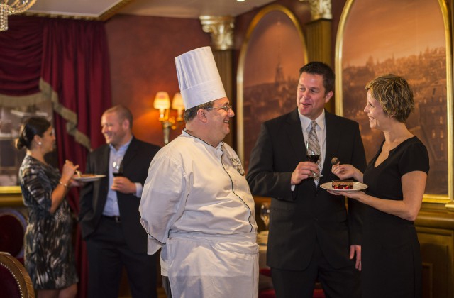 For the next four courses, guests move through the main dining room where they are presented with a superb French-inspired dish, such as grilled salmon with smoked salmon cream and Kobe beef with turnip and potato gratin, along with a specially selected glass of wine at each station. This unique tasting opportunity concludes with a sophisticated dessert and the final wine pairing in the private Chef’s Table dining room.