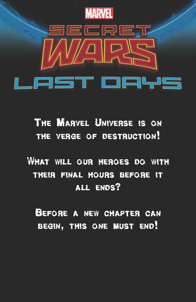Battleworld is set to transform the Marvel Universe as you know it. But before Secret Wars can begin, this chapter must come to a close. What will our heroes do with their final hours? What secrets will be unearthed? Who will they want to spend their LAST DAYS with?