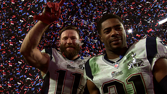 Edelman and Butler each contributed huge plays for the Patriots in the final minutes of the game, giving New England its fourth Lombardi Trophy. Edelman caught a touchdown pass late in the fourth quarter to give the Patriots the lead and what turned out to be the winning score. Then, with 20 seconds left in the game and the Seahawks on the verge of scoring, cornerback Butler intercepted a pass on the goal line to seal the victory. Edelman’s touchdown catch was one of his nine receptions in the game, for 109 yards.