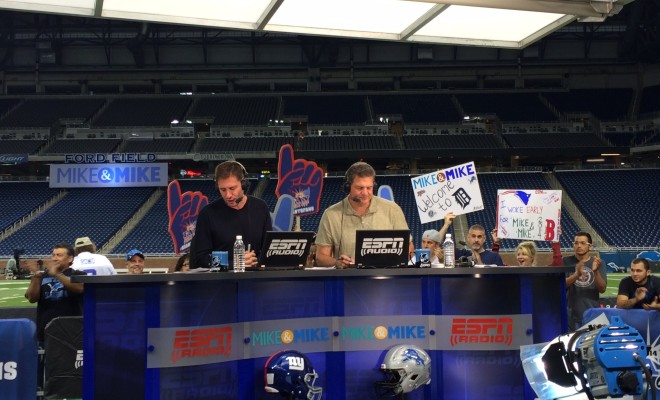The six-stop tour will include four NFL stops and one college football date, with the sixth and final stop to be determined. In addition to the NFL’s Kickoff Weekend, highlights of the NFL tour include: Mike & Mike live from Green Bay, Wis., in advance of Monday Night Football’s telecast of the Kansas City Chiefs vs. the Green Bay Packers; a stop in Indianapolis for the Colts vs. the New England Patriots; and a show from Dallas when the Cowboys host the Seattle Seahawks. Mike & Mike will have one college visit on Friday, Nov. 20, for a rivalry matchup between the Michigan State Spartans and the Ohio State Buckeyes.