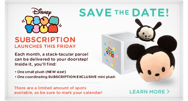 Disney Store's Tsum Tsum subscription service is launching on Friday, October 9. The monthly cost will be $24.95. Each box will include one exclusive mini-plush with a new small plush (not exclusive). The small size is new and is 4.5 inches compared to the 3.5 inch mini and the 11 inch medium sizes.
