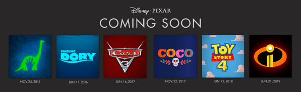 Pixar has just announced their release schedule through 2019. In making the announcment, Pixar revealed that Toy Story 4 is being postponed from 2017 to 2018 with Cars 3 taking its place. Here is the full schedule: