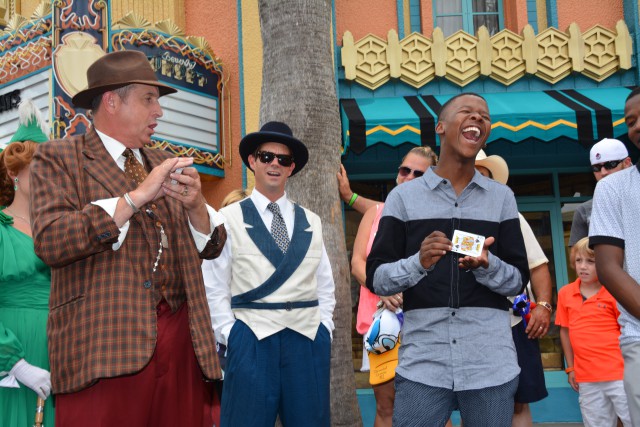 In between a quick tour of the park, Mayor Burbank introduced the students to the other members of Citizens of Hollywood during one of its performances on Sunset Boulevard. This particular show included a few magic tricks from talent agent Jack Diamond, who showed off his skills with a deck of cards as the smiling teenagers watched intently. More activities occurred later in the afternoon backstage at the Prop Shop, where Streetmosphere actors Terry Ward, Garin Jones and Cameron Francis met up with the group for a magic workshop. After a discussion about career advice and show techniques, the students were challenged to create their own magic show on the spot to perform in front of a Disney show director and producers.