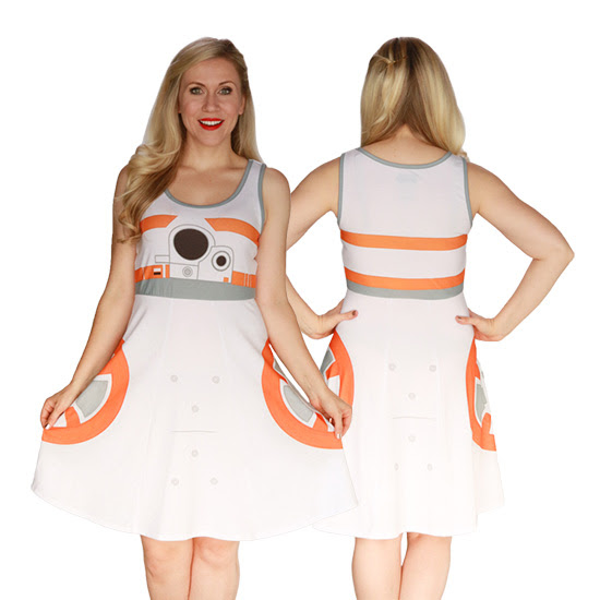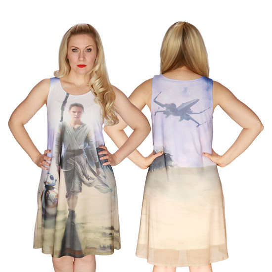 This beautiful new Star Wars: The Force Awakens swing dress from Her Universe features the resilient survivor and scavenger, Rey, with the trusty little droid, BB-8, as they trek through the harsh desert world of Jakku.