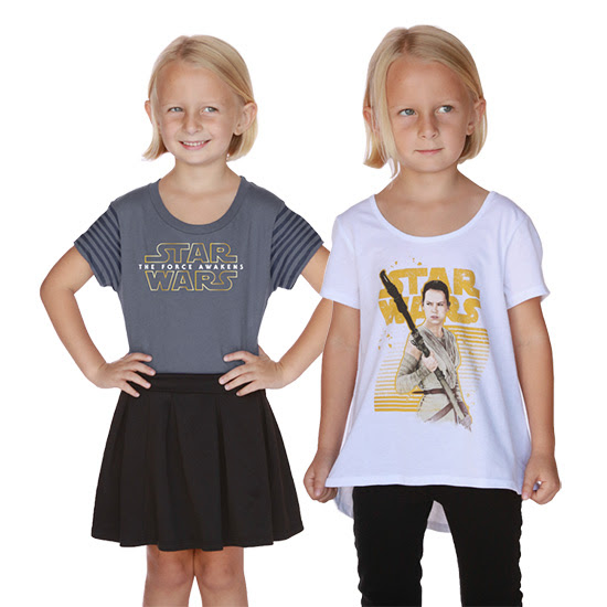 Above left: Star Wars is for everyone and this stylish new striped Youth tee from Her Universe featuring The Force Awakens logo can be proudly worn by young girls everywhere showing their love for that galaxy far, far away! Above right: The Force Awakens on this new Youth baseball tee from Her Universe featuring the powerful image of Rey, played by actress Daisy Ridley, on the front.