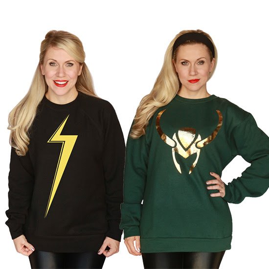 Marvel fan? Her Universe has you covered! Above left: Channel your inner superhero when you wear this powerful Ms. Marvel sweatshirt from Her Universe featuring her lightning bolt logo. Empower your wardrobe day or night with this piece as it glows in the dark! Above right: Imagine being everyone's favorite character from the magical realm of Asgard, but, beware, because this regal Loki sweater from Her Universe (printed in gold foil) may cause you to be mischievous!