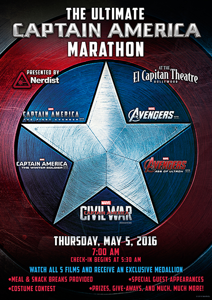The El Capitan Theatre in Hollywood will present The Ultimate Captain America Marathon presented by Nerdist at 7 AM on Thursday, May 5. This event showcases 5 movies -shown in release order- and culminates with a 7 PM screening of Marvel's Captain America: Civil War.