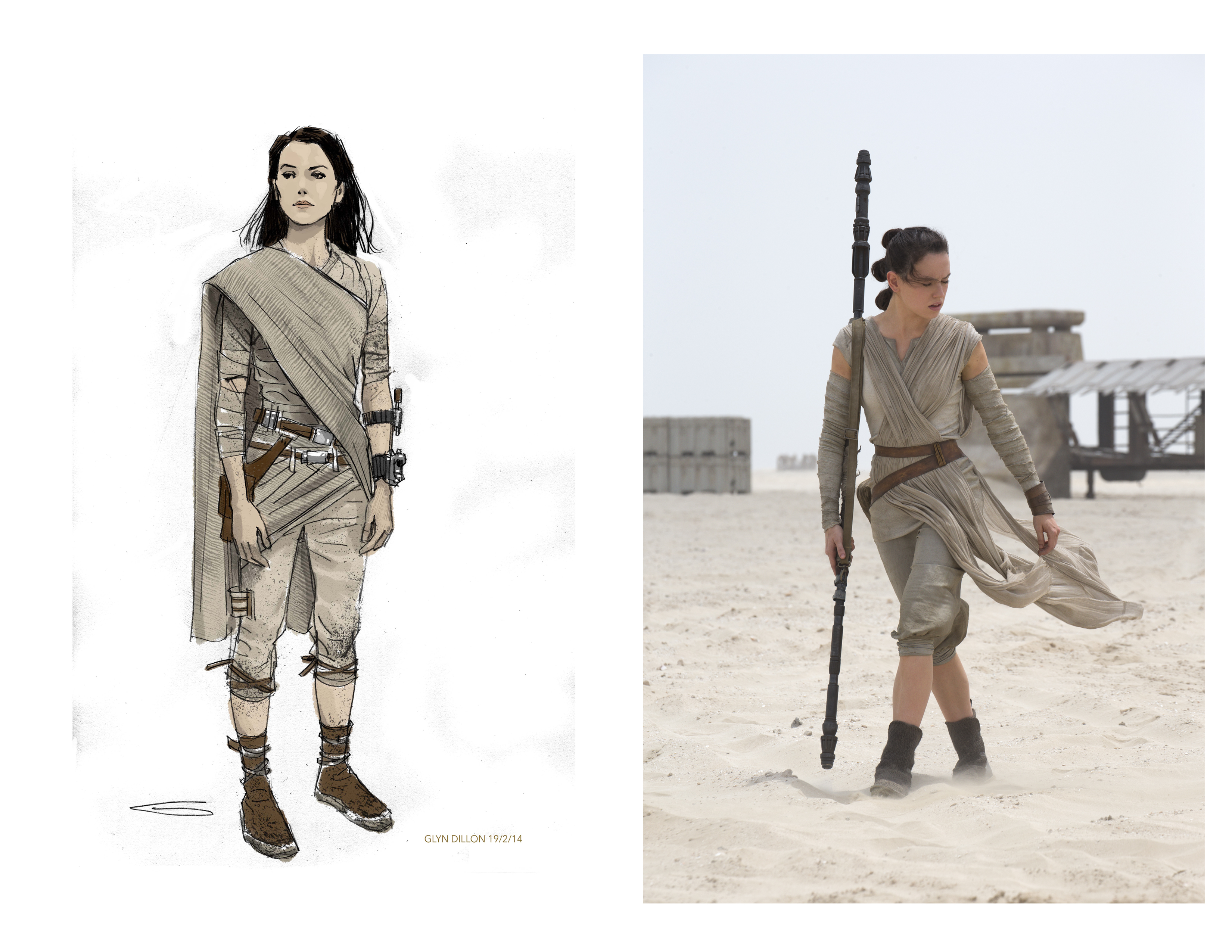 Continuing, he says, “We eventually gave her a wrap, which could protect her face against dust storms. Everything is there for a reason, but it gives her a very beautiful image when all the pieces are put together. Rey wears the costume throughout the film, although we had 25 copies made and about 12 pairs of boots.”