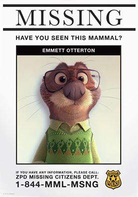 Mammals have started going missing in Zootopia. Those with information about the whereabouts of Enmett Otterton are encouraged to contact the ZPD Missing Citizens Department at 1-844-MML-MSNG.