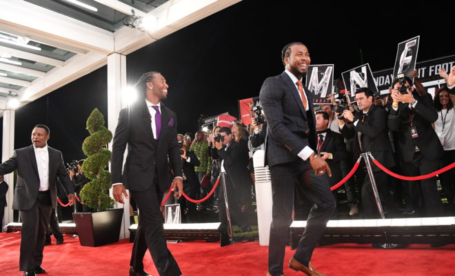 McDonough, Gruden and Salters exit the car, followed on the carpet by a flood of NFL players representing the past and present of Monday Night Football. Players pose for pictures and wave to the crowd as they reach the entrance to the stadium. Some of the interactions include Washington Redskins cornerback Josh Norman getting a hug from a fan; New England Patriots tight end Rob Gronkowski posing for a picture in sunglasses; and Pittsburgh Steelers Hall of Famer Franco Harris waving a famed Terrible Towel.