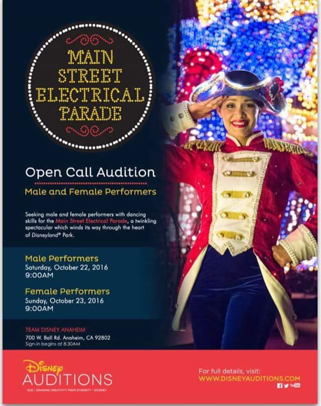 As the Main Street Electrical Parade prepares to head west, returning to Disneyland after an extended vacation in Walt Disney World, the resort is looking for male and female performers to join the parade's cast. Open auditions for performers with dancing skills will be held on Saturday, October 22nd and Sunday, October 23rd for male and female performers respectively at the Team Disney building in Anaheim, California.