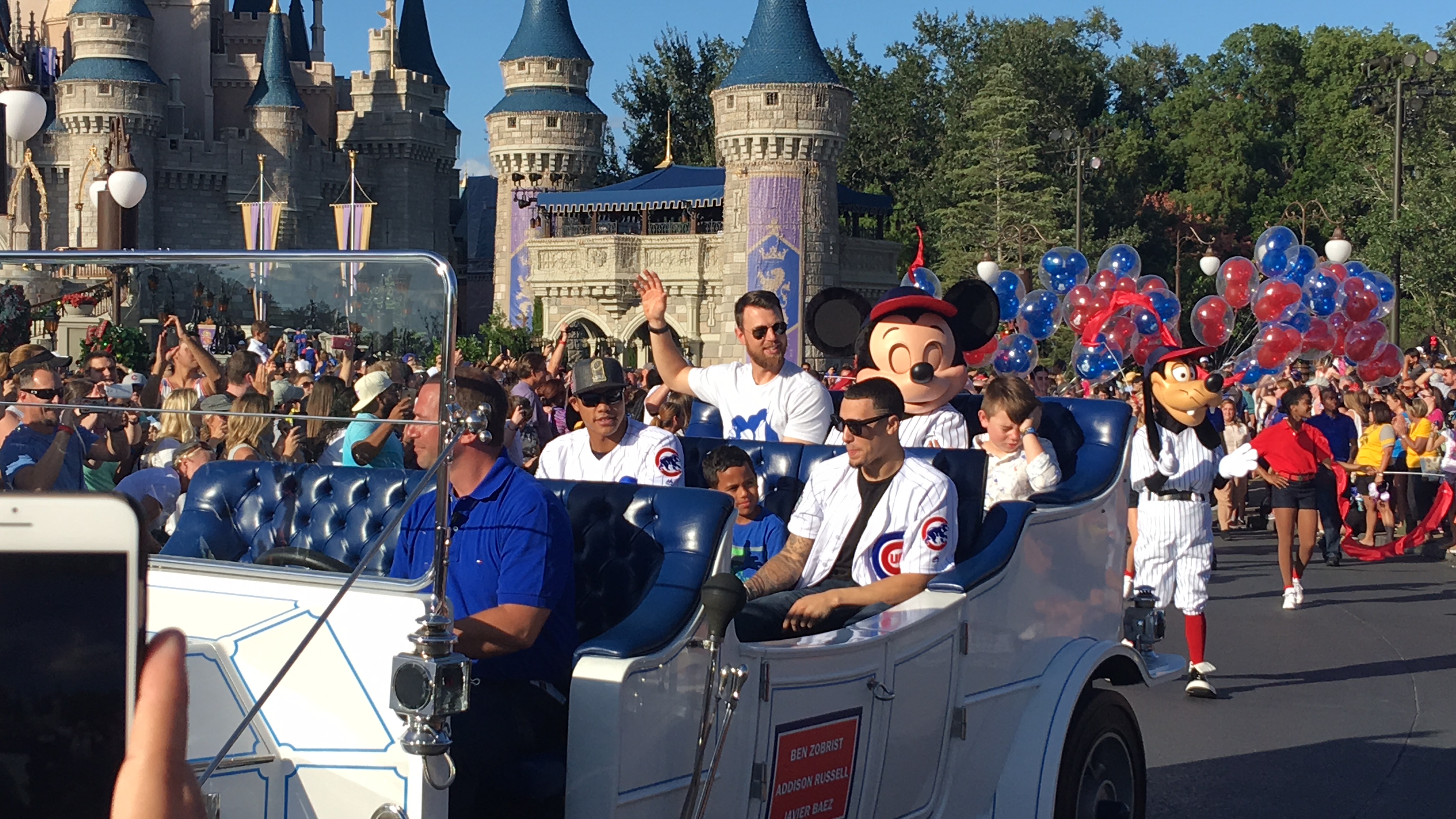 Championship MVP Ben Zobrist, Addison Russell and Javier Baez rode along with Mickey Mouse as a throng of cheering fans, many dressed in the team’s colors, lined the parade route at Magic Kingdom waving “W’’ flags and holding signs.