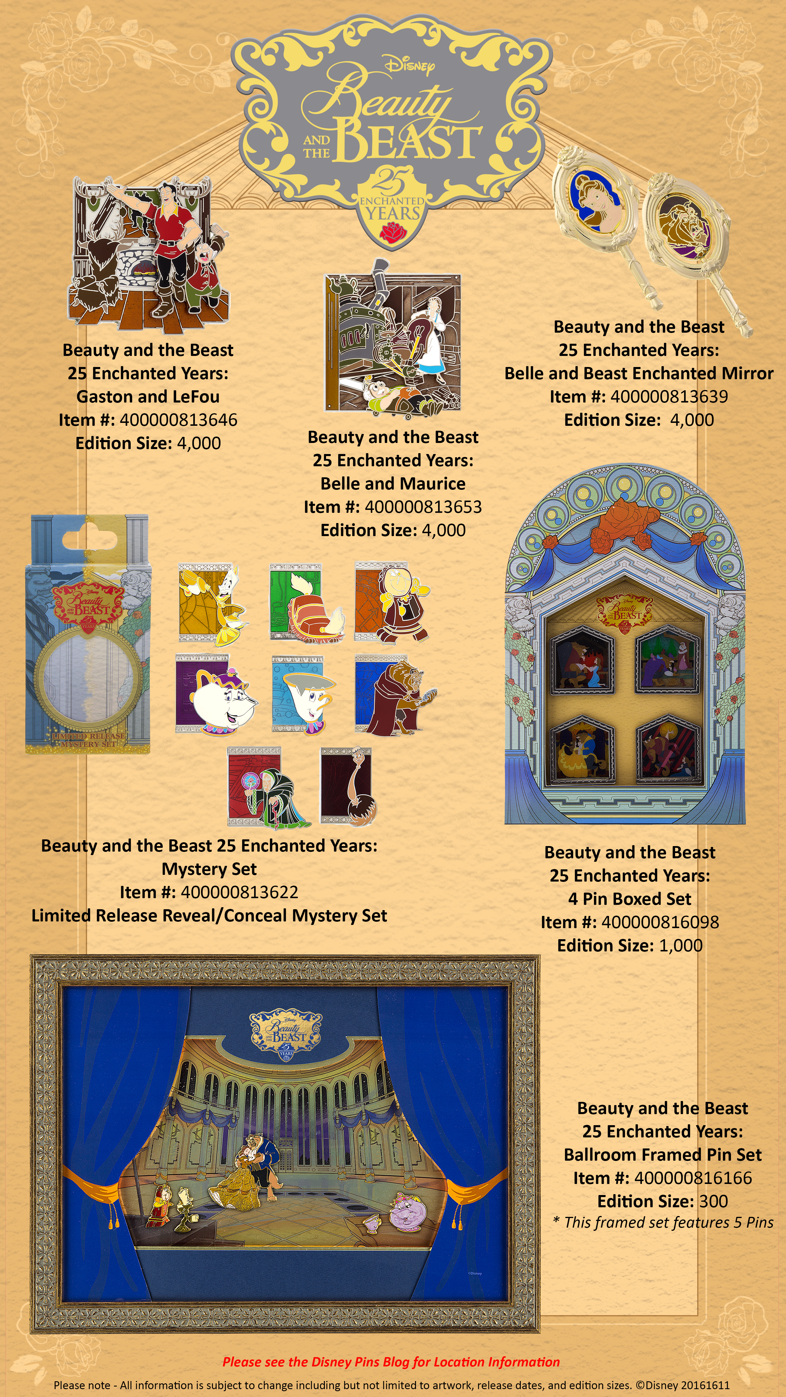 Tomorrow, November 22nd, 2016, several new pins will be released celebrating the Disney classic Beauty and the Beast. These releases will coincide with the film's 25th anniversary. Here's a look at the pins, which will be available throughout the Disneyland and Walt Disney World Resorts while supplies last: