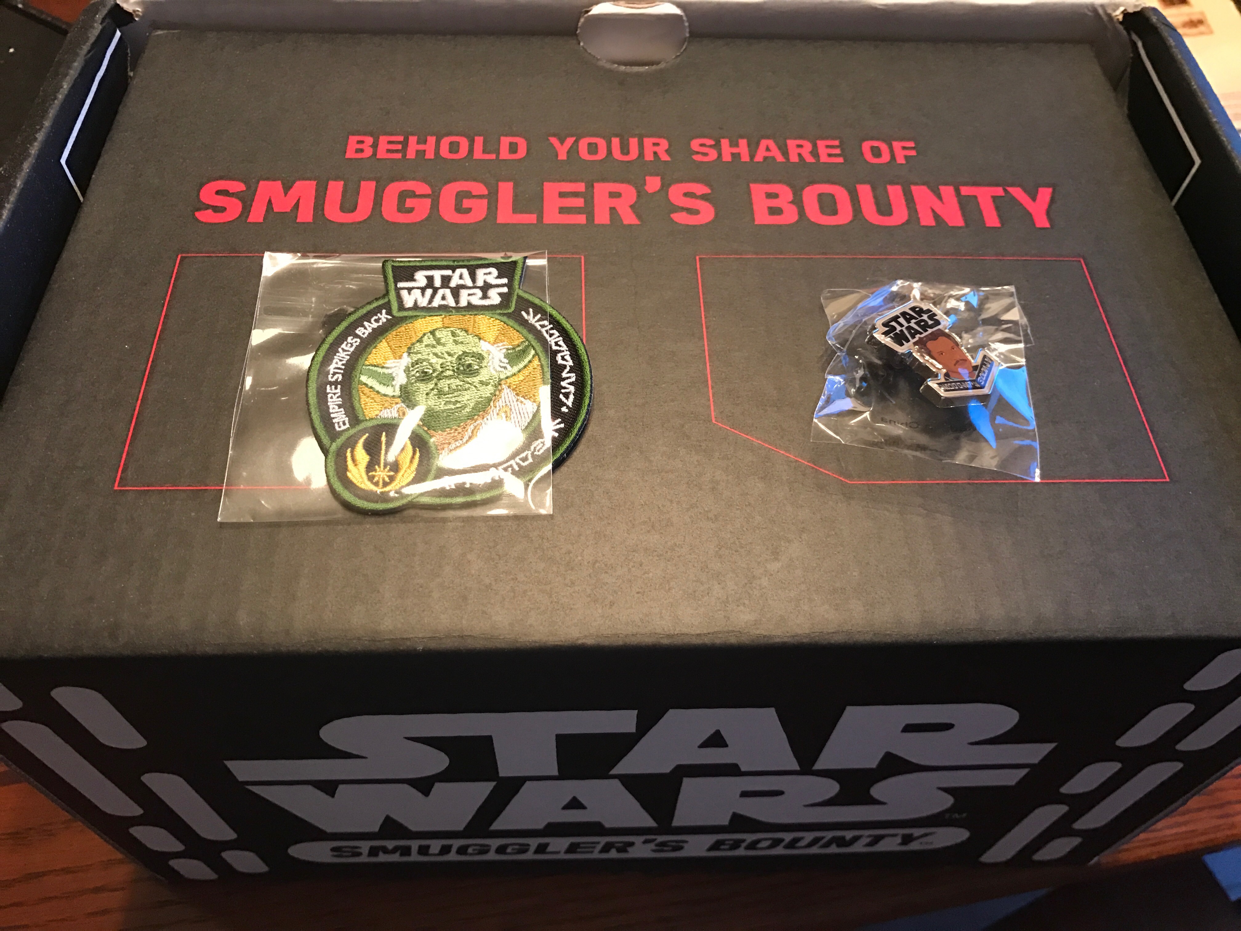 The box always includes a patch and a pin. This month, the patch features Yoda while the pin showcases Lando Calrissian.
