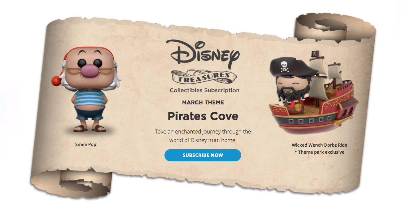 Today, Funko announced that they'll be launching a new subscription box service themed to Disney, including figures and accessories inspired by both films and theme parks. Each Disney Treasures box will contain exclusive items created by Funko for subscribers. The first box will be titled "Pirates Cove," and feature a Mr. Smee Pop! figure in addition to goodies.