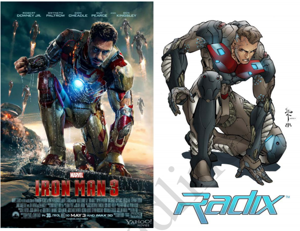 While part Horizon Comics' lawsuit against Marvel and Disney over Iron Man 3 has been tossed out by a judge, on element of the suit involving the poster for the film is moving forward. As Deadline reports, in a suit filed nearly two year ago, Horizon alleged that Iron Man's armor in the film resembled their comic Radix. U.S. District Judge J. Paul Oetken said that there were “dissimilarities” and “differ in significant respects” between the comics and film that led him to dismiss much of the suit. However, it was a different story in regards to a pose Stark strikes on the one-sheet for the 2013 film: