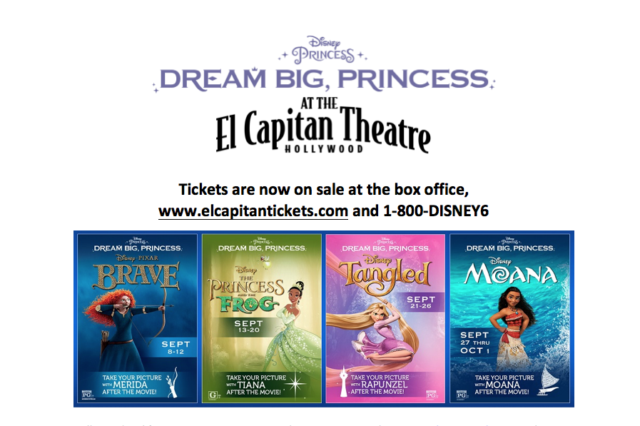 Tckets are now on sale at www.elcapitantickets.com, by calling 1-800-DISNEY6 (347-6396) and at The El CapitanTheatre box office, for Dream Big Princess at the El Capitan Theatre, a special collection of movies being presented in conjunction with the Disney “Dream Big, Princess” initiative September 8 to October 1, 2017.