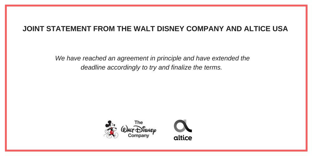 It appears that the stalemate between Disney and Altice USA, which runs Optimum cable systems, has ended. In a joint statement they said, "we have reached an agreement in principle and have extended the deadline accordingly to try and finalize the term."