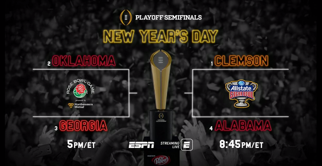 ESPN’s presentation of the College Football Playoff Semifinals on New Year’s Day will include its MegaCast production, as the traditional telecast of the Rose Bowl Game Presented by Northwestern Mutual featuring No. 2 Oklahoma vs. No. 3 Georgia (5 p.m.) and the Allstate Sugar Bowl between No. 1 Clemson and No. 4 Alabama on ESPN will be supplemented with 10 alternate viewing options across ESPN2, ESPNEWS, ESPN Goal Line, ESPN Deportes, SEC Network and multiple ESPN3 feeds. Each of the presentations will be available on the ESPN App.