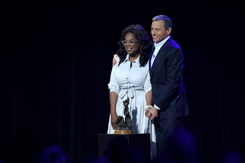 Bob Iger presented Oprah with the Disney Legend Award at the 2017 D23 Expo. Oprah will be seen in Disney's A Wrinkle in Time this March.