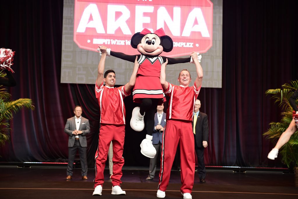 ESPN Wide World of Sports executives, along with AAU and Varsity executives, marked the grand opening with a ribbon-cutting ceremony that featured streamers as cheerleaders performed a high-energy routine involving Minnie Mouse, who sported her new cheerleading outfit.