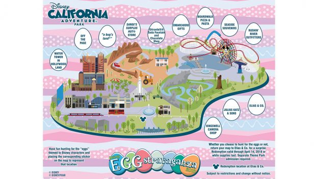 In just a couple of weeks, a spring tradition will return to the Disneyland Resort. Egg-stravaganza scavenger hunts will take place in Disneyland Park, Disney California Adventure, and Downtown Disney from March 16th through April 1st (while supplies last). Guests can participate by purchasing an Egg-stravaganza map and stickers for $5.99 plus tax at select merchandise locations throughout the resort. With maps in hand, guests can search for differently decorated eggs and label their location with the corresponding tickets. Guests can then present their finished hunt maps to receive a special prize (Redemption locations will be located at Elias & Co. at Disney California Adventure park, Disney Showcase in Disneyland park, and World of Disney Store in the Downtown Disney District).