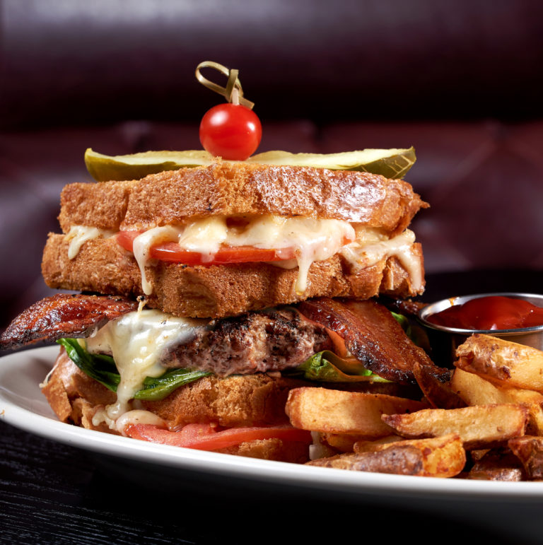 Layers of fontina, muenster, gruyere, and alpine swiss provide a heavenly gooey flavor nestled between four slices of bread to make the ultimate double-decker sandwich. Complete with our signature blend of sirloin, shortrib, brisket, and smoked bacon, look no further to satisfy your every comfort food craving. In-season Florida tomatoes, fresh from local farms top the burger to tantalize your tastebuds.