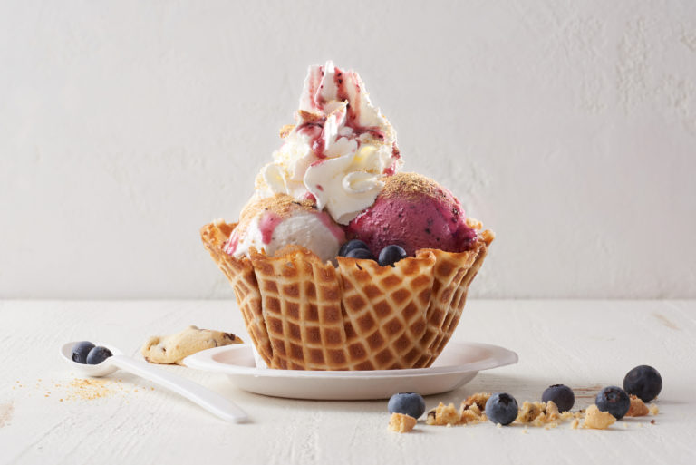 Blueberry Pie – Blueberry sorbet, vanilla gelato, biscotto gelato, blueberry sauce, fresh blueberries, graham cracker crumbles, and whipped cream