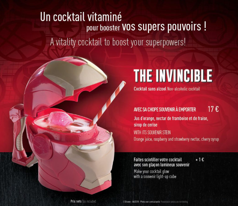 - The Invincible – non alcoholic cocktail made with orange juice, raspberry and strawberry nectar, and cherry syrup. For an additional 1€ you can add a souvenir light up cube that will make your drink glow!