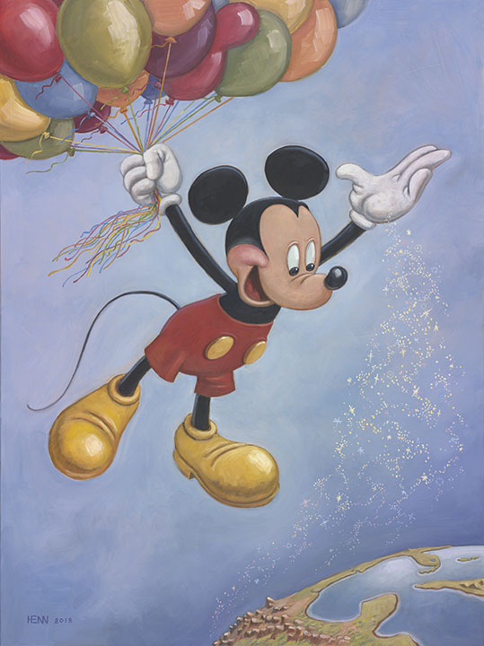 - Mark Henn, animator and artist of "Spreading Happiness Around the World”: “It is one of the great honors of my career to be asked to paint Mickey’s 90th birthday portrait. I was greatly inspired by the portraits painted by John Hench. I wanted to capture some of the same style and sense of youth that John achieved in his portraits.”