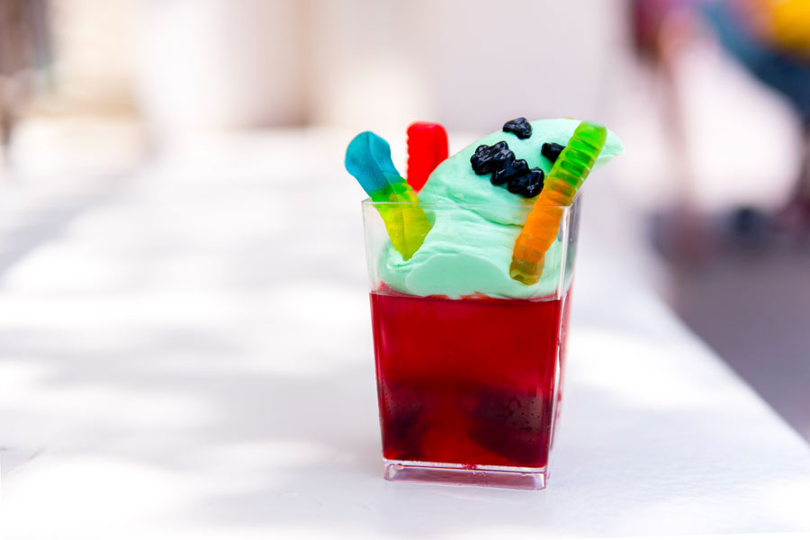 - Oogie Boogie Meringue – Gaston’s Tavern (available on party nights only) Pomegranate-cherry gelée and gummy worms topped with glow-in-the-dark meringue AND it’s gluten-friendly!