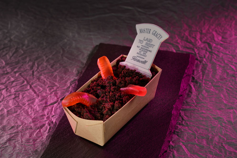 - Worms & Dirt – Pecos Bill Tall Tale Inn and Café (available on party nights only; available daily starting October 1) The Worms & Dirt chocolate pudding is topped with gluten-friendly cake crumbs, gummy worms, and a chocolate grave stone.