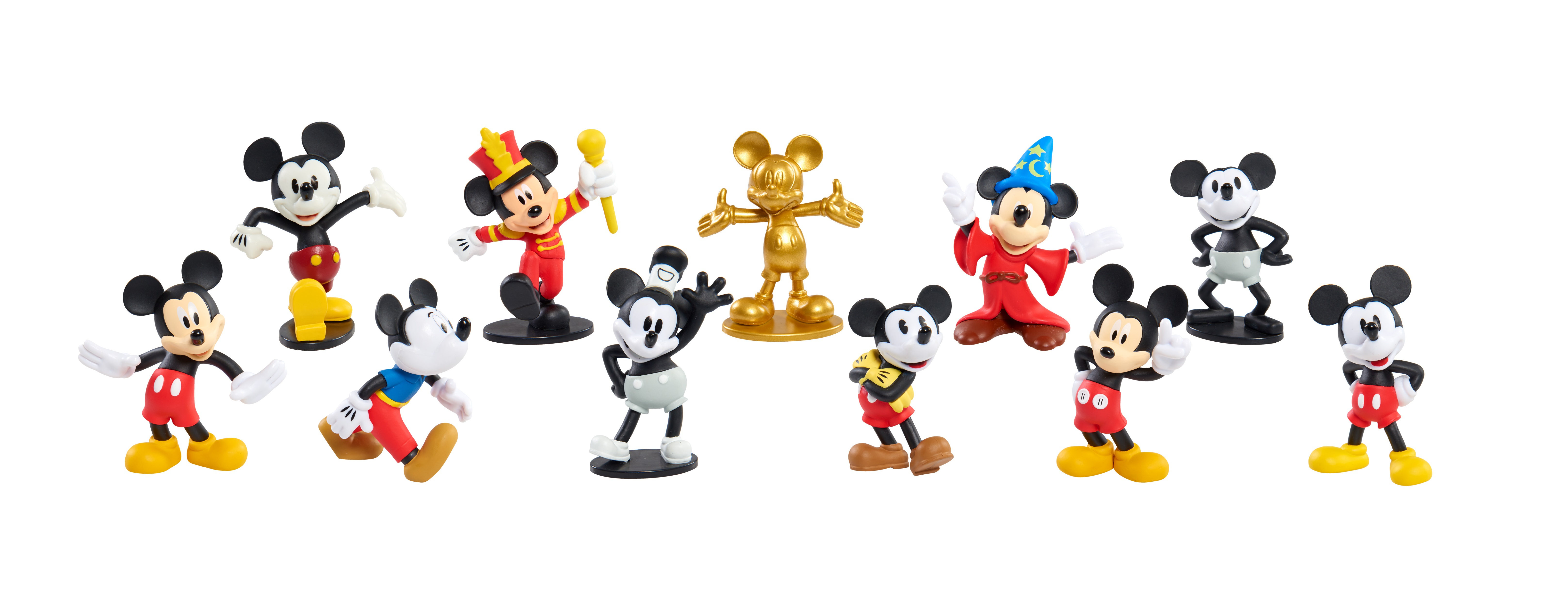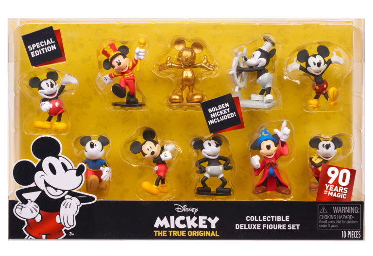 - 10 highly detailed Mickey Mouse figures and features special 90th Anniversary packaging. Mickey comes dressed in some of the most iconic styles he’s worn through the ages including: Plane Crazy Mickey, Pie-Eye Mickey, Sorcerer’s Apprentice Mickey, Steam Boat Willie Mickey, Mouseketeer Mickey, Comic Mickey, Clubhouse Mickey, New Shorts Mickey, and exclusive Golden Mickey. Each figure comes in a unique pose and stands 3” tall – the perfect size for both play and display! Available at Target, Amazon, and Walmart.
