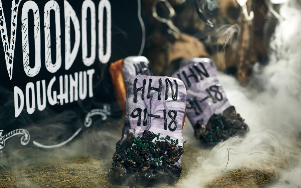 - Finally, Voodoo Doughnut will offer a Halloween Horror Nights Tombstone Doughnut consisting of raspberry Bavarian cream, cookie crumble dirt and green grass sprinkles.