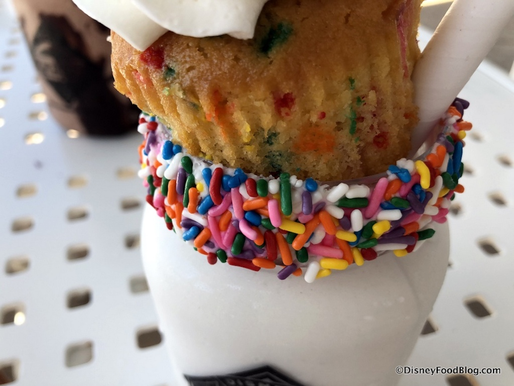 A giant vanilla milkshake served in a rainbow sprinkle-rimmed mug, finished with a vanilla confetti cupcake topped with icing and a chocolate Mickey Mouse.