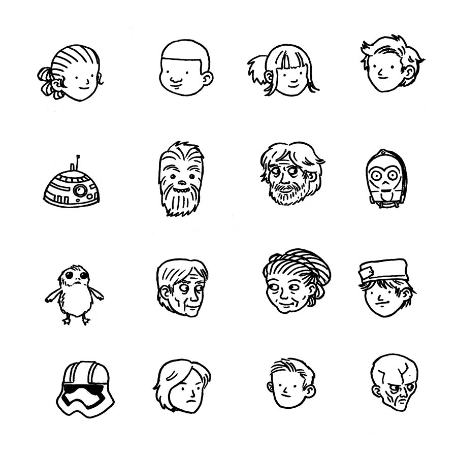 - “The first step is to simplify, and boil the look of the character down to a few elements. Some of the costumes have a lot of detail, but if I draw too much detail in a costume, it doesn’t gel with the cartoony look of the characters’ faces — especially when I’m drawing Rey as a little kid.” Brown explained to StarWars.com, regarding his artistic process. “The other thing to focus on is body language and expressions. Rey is someone who dives right in, and can be very decisive and isn’t afraid to try and fail.”