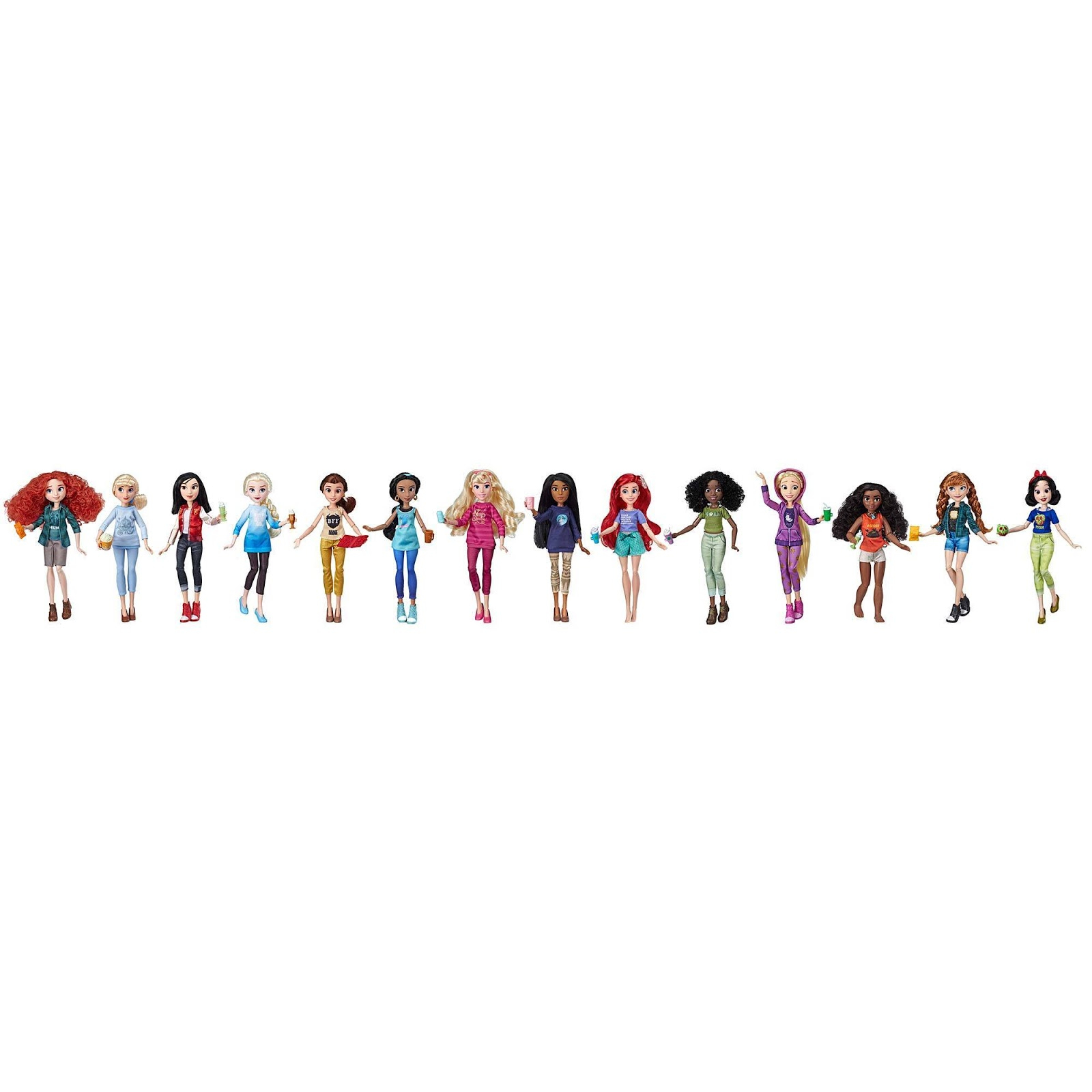 Inspired by the Princesses from Disney's Ralph Breaks the Internet, these dolls are dressed in casual, comfy outfits with fun, modern-day accessories. This pack of 14 fashion dolls makes the ultimate gift for kids who love Disney movies. All of the dolls rock cute outfits that include removable bottoms and tops and have soft rooted hair, ranging from curly to straight, red hair, black hair, blonde hair, and brunette hair. Most of the dolls come with removable pairs of shoes, from wedges to high-top sneakers to clogs. These Disney dolls also come with movie-inspired accessories, including fun pretend snacks, headbands, and more.